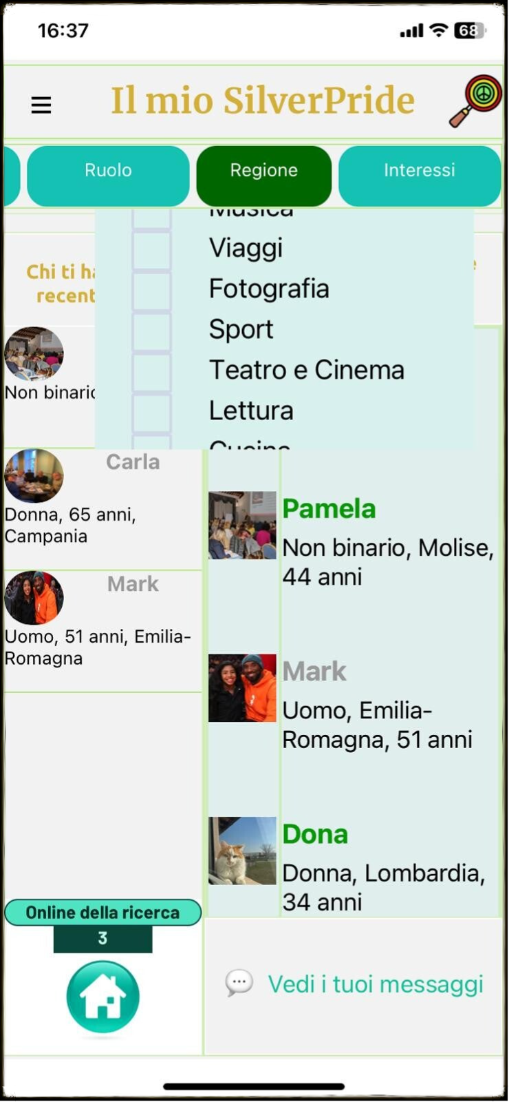 Sul lato destro, invece, si trovano i risultati delle ricerche effettuate tramite la lente: queste possono essere condotte con o senza l’utilizzo dei criteri disponibili nella barra dei filtri di ricerca, tra cui “Cosa cerchi”, Regione, Ruolo, Interessi e altri parametri personalizzabili. In basso a destra, una notifica segnala l’arrivo di nuovi messaggi: da qui è possibile accedere direttamente alle nuove conversazioni o, in assenza di novità, consultare la propria lista completa di messaggi. In alto a sinistra è presente il menu ad hamburger, che offre diverse funzioni di gestione del profilo: visualizzare e aggiornare i dati personali; aggiungere ulteriori informazioni al proprio profilo; uscire dall’app in modo sicuro. Da questi due schermi principali – Home e Il Mio SilverPride – si sviluppa l’intera architettura funzionale dell’app SilverPride, pensata per favorire connessioni autentiche, scambio di contenuti e crescita della community